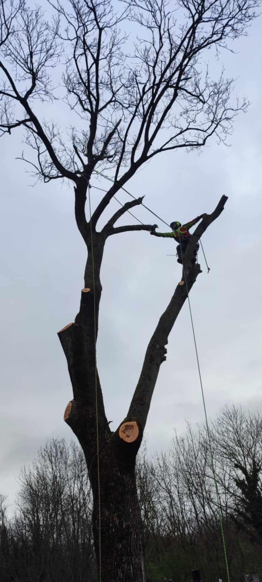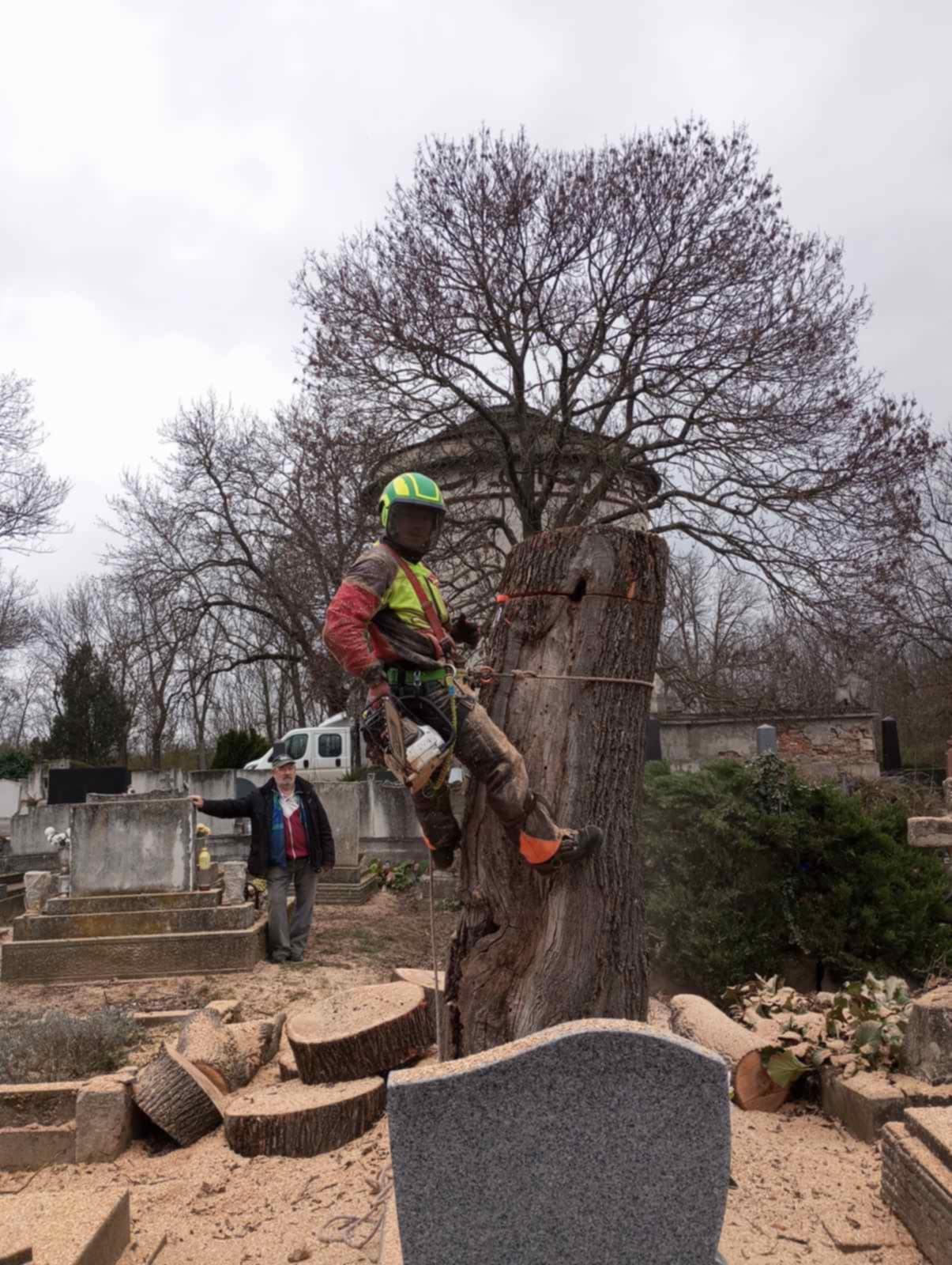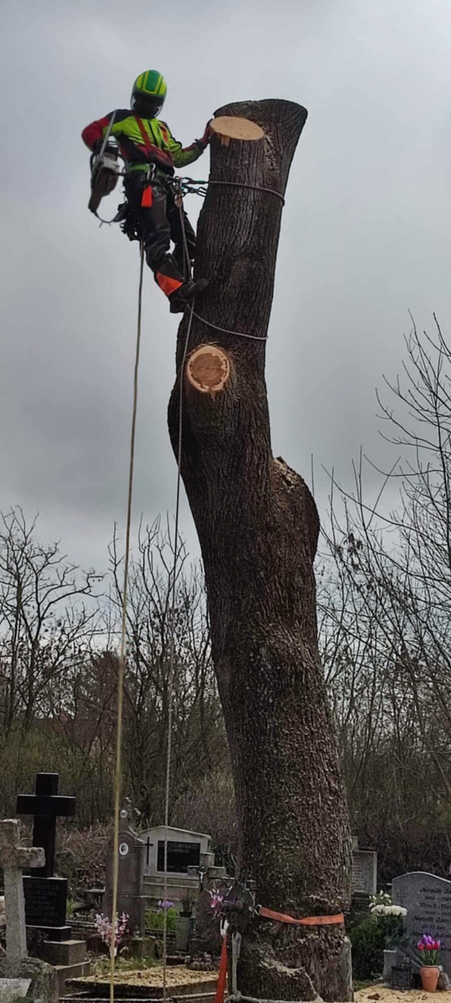 Favaágás alpintechnikával, veszélyes fák kivágása, gallyazása.